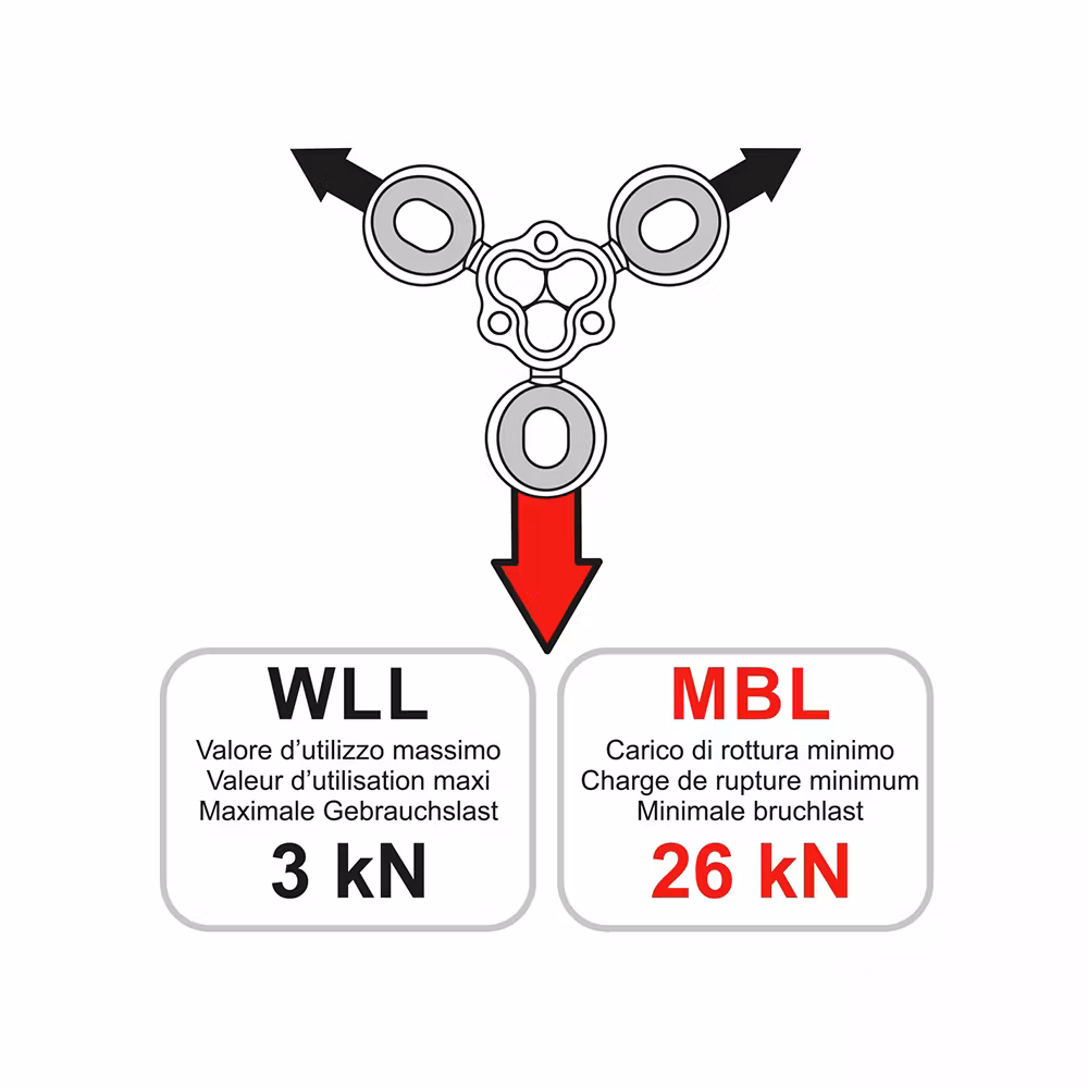 Ett kompakt och extremt mångsidigt riggsystem med vår trippelsvängkonstruktion. Gyro3 roterar vid alla tre anslutningspunkterna vilket möjliggör otaliga möjligheter till koppling mellan olika element som behöver rörelsefrihet. Bara några få möjligheter inkluderar: självorienterande multiförankring, flera anslutningar till en sele, förhindrande av vridning i Y-linor, korsdragningsoperationer, tyrolska traverser, komplexa räddningsprocedurer. Den innovativa designen förhindrar även ansamling av smuts och gör inspektionen enkel. Huvudstrukturen är kolstål med en dubbel korrosionsskyddande beläggning. Svängkulor och fästpunkter är av rostfritt stål. Inkluderar tre avtagbara silikon-antirotationsinsatser. Arbetsbelastningsgräns: 3 kN. Minsta brotthållfasthet: 26 kN.